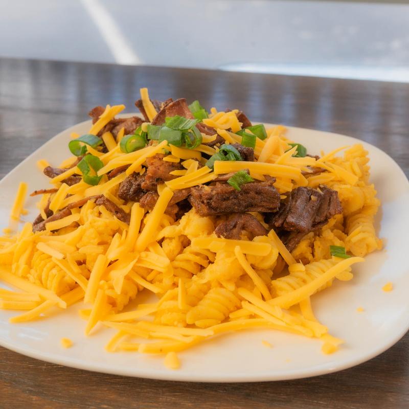 Regular $10.99 | Large $14.99 | Bariatric $14.99 • Slow-roasted beef brisket over roasted cauliflower, dairy-free cheese, and BBQ sauce.