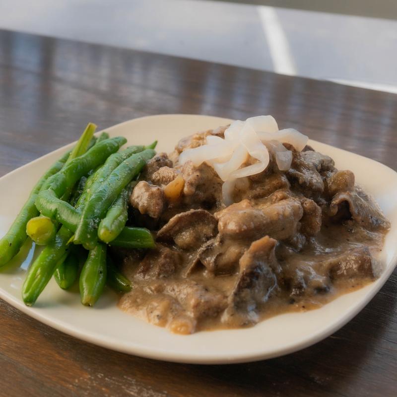 Beef stroganoff w/low carb noodles & sauteed green beans. This is a bariatric portion meal, 5oz serving total.